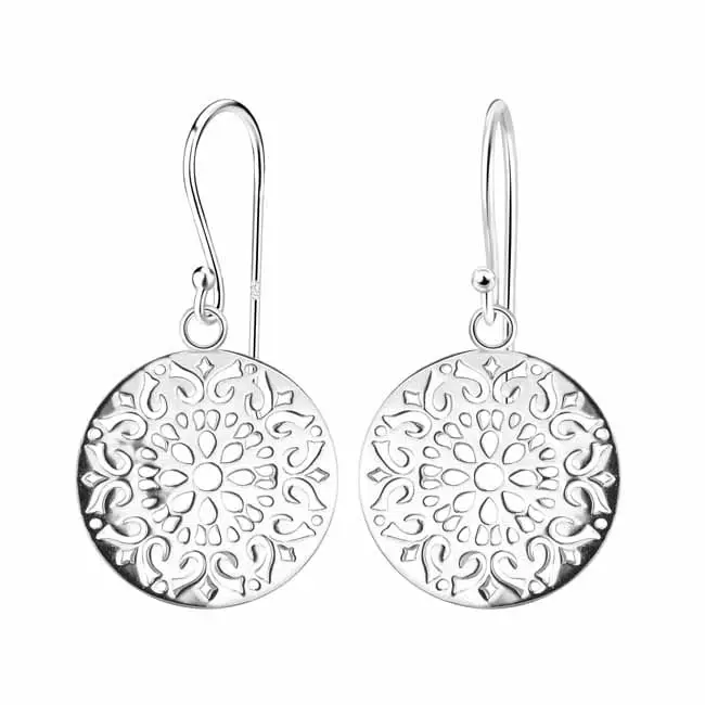 Hopeiset roikkuvat ornamentti/filigraani-korvakorut. Koruosan halkaisija on 18 mm. Korvakorujen valmistusmateriaali on laadukas nikkelitön 925 sterling hopea.
