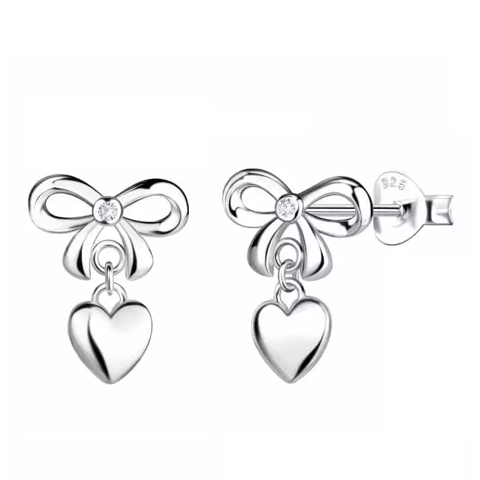 Hopeiset rusetti-korvikset, joista roikkuu kiiltävät sydämet. Korvakorujen koko on 13 x 15 mm. Rusetin keskellä on pieni zirkonia-kivi säihkymässä. Korvakorujen valmistusmateriaali on laadukas nikkelitön 925 sterling hopea.