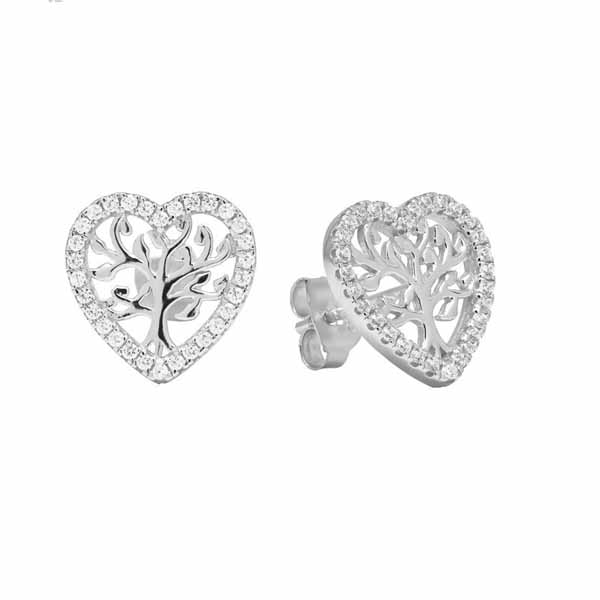 Hopeiset sydämen muotoiset korvakorut zirkonia-korukivin koristeltuna. Korvakorun keskellä on kaunis elämän puu -kuvio. Korvakoruissa on tukeva tappikiinnitys. Valmistusmateriaali on nikkelitön 925 sterling-hopea.
