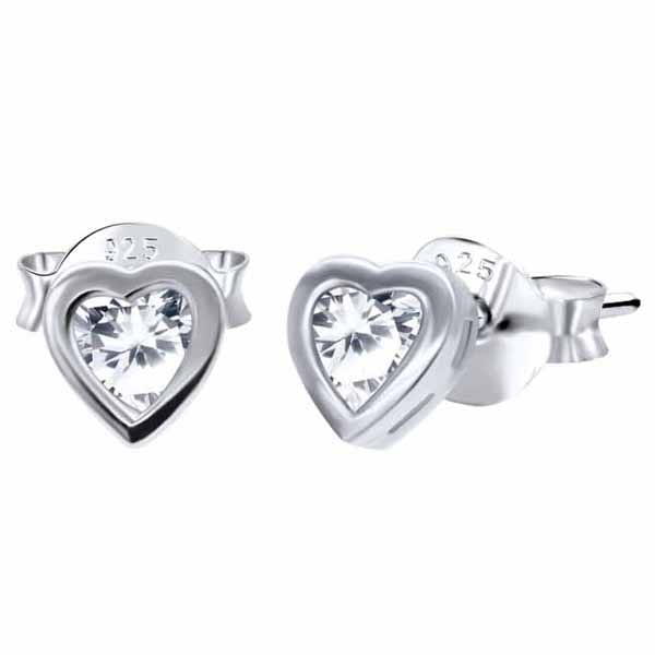 Hopeiset sydänkorvakorut zirkonilla Sydämen muotoiset hopeakorvakorut, joiden keskellä säkenöi kirkas zirkoni-korukivi. Nappikorvakorujen koko on 4,5 mm ja niissä on luotettava tappikiinnitys.... Lue lisää