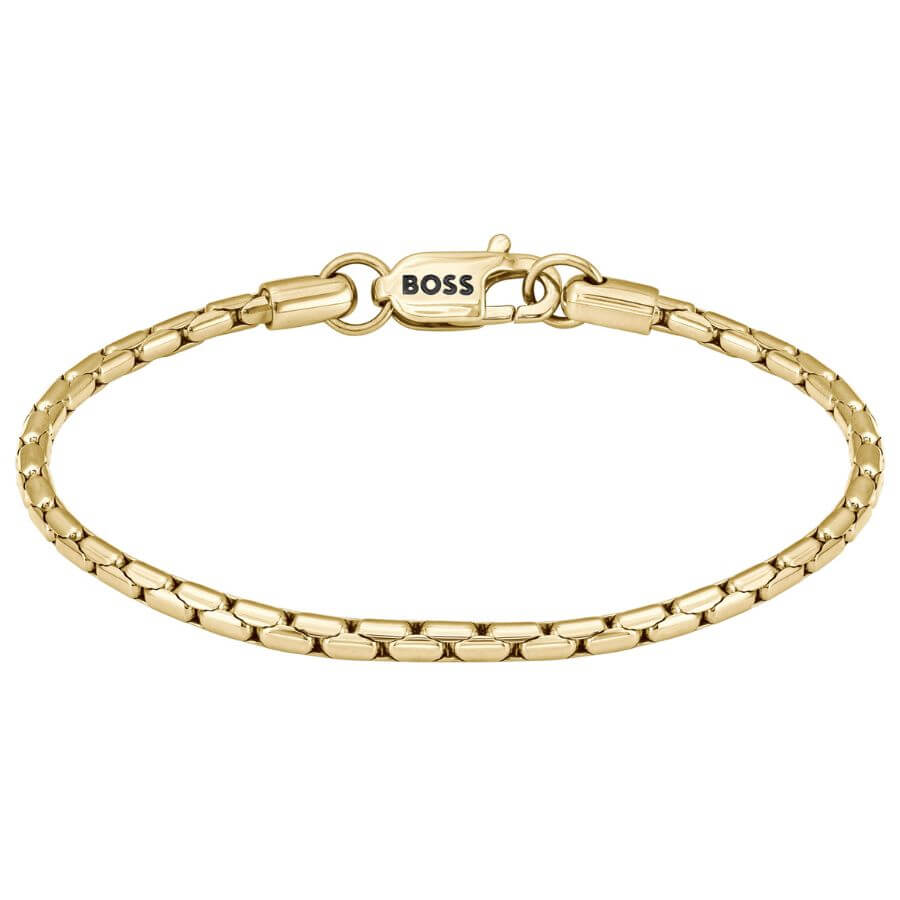 Pelkistetty miesten kullan sävyinen teräksinen rannekoru. Rannekorun leveys on 3 mm ja pituus 19 cm. Tämän miesten käsikorun ruostumattomasta teräksestä valmistettua lukkoa koristaa Boss-logokaiverrus.