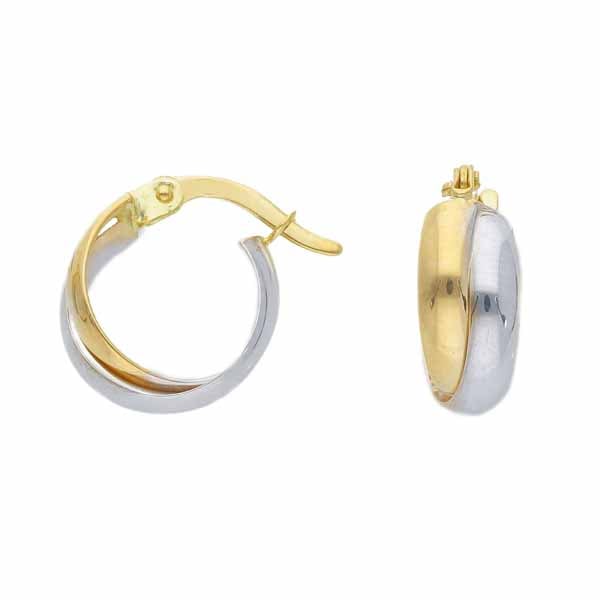Kaksiväriset kultaiset korvarenkaat. Renkaan halkaisija on 12 mm ja leveys 5 mm. Materiaali on 14 karaatin keltakulta ja valkokulta. Korvakoruissa on kätevä saranakiinnitys.