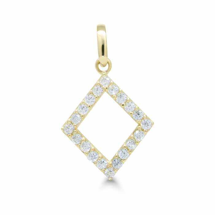 Keltakultariipus zirkoneilla – materiaali: 585/1000 (14k) keltakultaa – synteettiset zirkonit – korkeus 11,5mm (ilman riipuslenkkiä), 17mm kokonaisuudessaan – leveys 10mm... Lue lisää