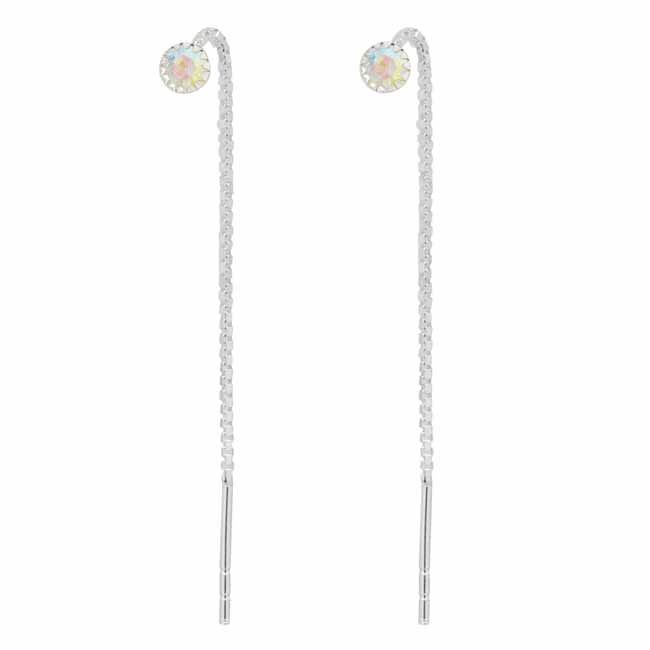 Hopeiset läpivedettävät ketjukorvakorut kirjavilla zirkoneilla. Kiven koko on 4 mm ja ketjukorvakorun pituus on 4 cm. Valmistusmateriaali nikkelitön sterling-hopea.