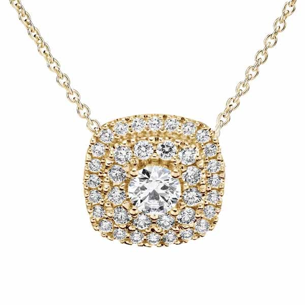 Keltakultainen naisten halo-timanttiriipus. Kotimaisena käsityönä valmistettu Kohinoor Valerie timanttiriipus on valmistettu 14 karaatin keltakullasta. Pyöristetyn neliön muotoisen riipuksen keskikivi on kooltaan 0,18 ct, ja sitä ympäröi 38 pienempää timanttia. Timanttien yhteispaino on 0,43 ct, laatu H/VS. Timanttiriipus on ostettavissa ilman ketjua tai säädettävällä 42/45 cm pituisella keltakultaisella ankkuriketjulla.