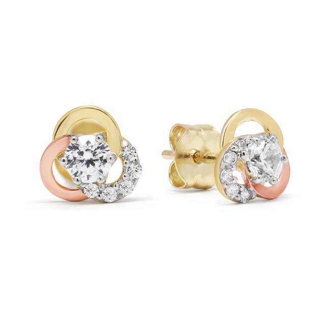 Kauniit kolmiväriset kukkakorvakorut synteettisillä zirkoneilla. Korvakorut ovat 14k kelta-, puna- ja valkokultaa.