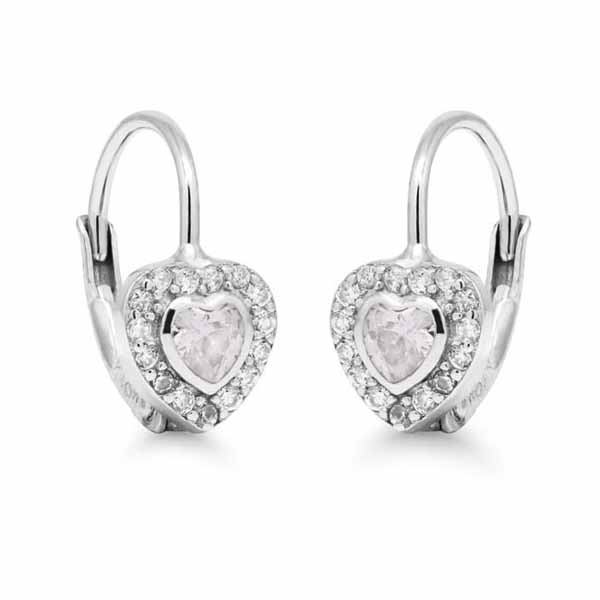 Roikkuvat sydän hopeakorvakorut kirkkailla synt.zirkoneilla. Jousellinen lukittava lukkomekanismi, helppo laittaa korvaan, sopii hyvin myös esim. lapsille