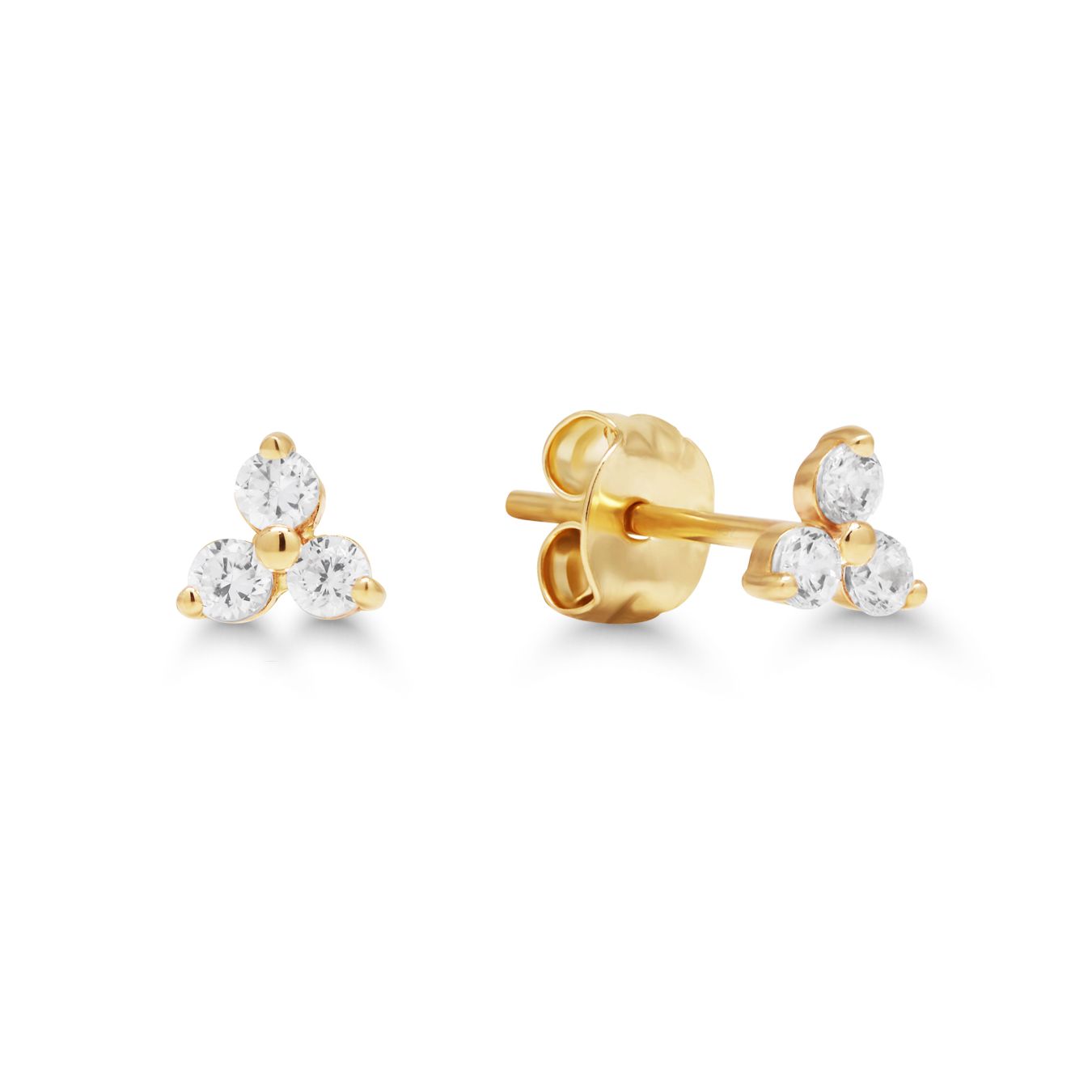 Keltakultaiset kirkkaat zirkoni nappikorvakorut, joissa kolme pyöreätä 1,7 mm synt.zirkonikiveä kolmion muotoon istutettuna.