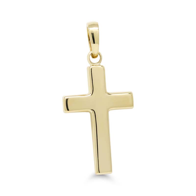 Keltakultainen kiiltävä kaksipuolinen ristiriipus - materiaali: 585/1000 (14k) keltakultaa - korkeus 18mm (ilman riipuslenkkiä), 25mm kokonaisuudessaan - leveys 12mm - Sileä kiiltävä pinta... Lue lisää