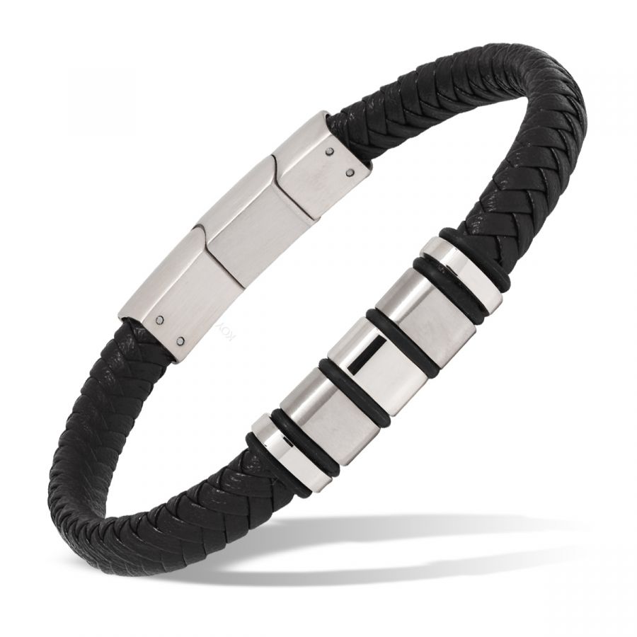 Tyylikäs miesten musta nahkarannekoru, jossa on teräksinen lukko-osa sekä teräksiset koristepalat. Rannekorun pituus on 21,5 cm, mutta rannekorun voi lyhentää rannekkeessa olevan palan avulla noin 20 cm pituiseksi.