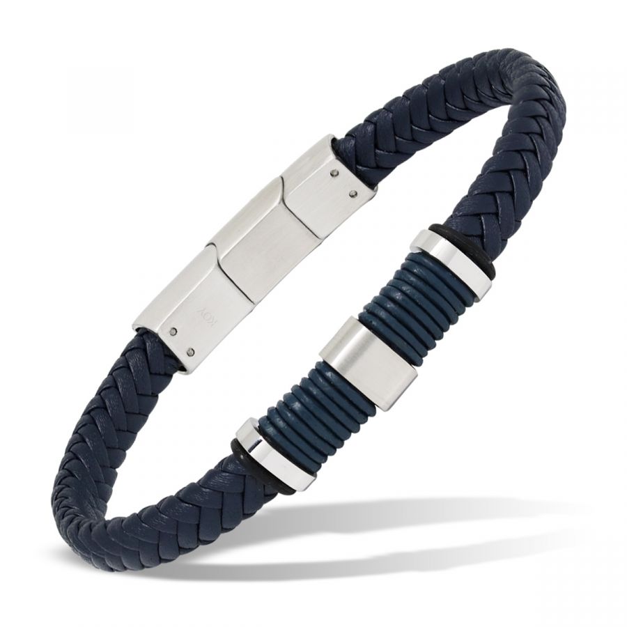 Tyylikäs miesten pelkistetty sininen nahkarannekoru, jossa on teräksiset lukko-osat ja koristepalat. Rannekorun pituus on 21,5 cm, mutta rannekorun voi lyhentää rannekkeessa olevan palan avulla noin 20 cm pituiseksi.