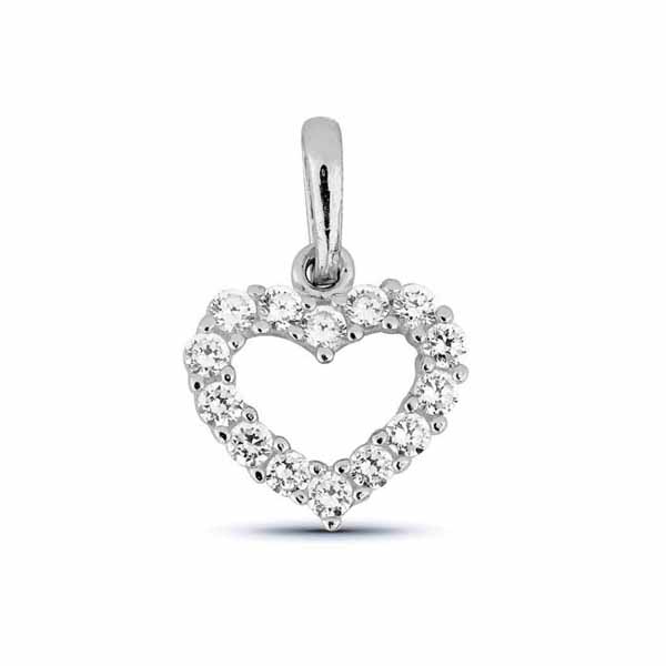 Valkokultainen sydänriipus kirkkailla zirkonia-korukivillä. Sydämen leveys on noin 9,5 mm ja korkeus 8 mm. Kokonaiskorkeus riipuslenkkien kanssa on noin 14 mm. Materiaali 14 karaatin valkokulta. Ei sisällä ketjua.