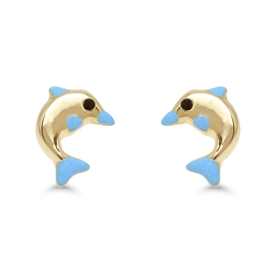 Suloiset delfiiniaiheiset korvakorut, jotka on valmistettu 14 karaatin keltakullasta. Sopivat niin lapsille kuin aikuisillekin. Korvakoruissa emaloidut siniset yksityiskohdat.