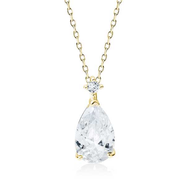 Hopeinen kullattu pisaran muotoinen riipus kirkkaalla zirkonia-korukivellä. Kirkkaan zirkonian yläpuolella säkenöi pienempi kirkas zirkonia-korukivi. Kyynelriipuksen koko on 8 x 17 mm. Hopeaketjun pituus on kätevästi säädettävissä kahteen eri pituuteen, 42 cm ja 45 cm. Valmistusmateriaali on laadukas nikkelitön 925 sterling hopea. Siro hopeinen riipus on täydellinen asuste jokapäiväiseen käyttöön!
