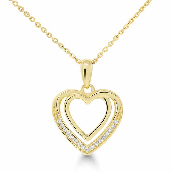 Sydämen muotoinen kullattu hopeakaulakoru kirkkailla zirkonia-korukivillä. Riipuksen koko on 16 x 16 mm. Kullattu hopeaketju on kätevästi säädettävissä pituuksiin 40-45 cm. Valmistusmateriaali on 925 sterling-hopea.