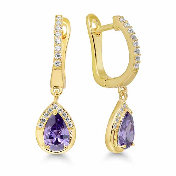 Kullatut korvarenkaat pisaran muotoisilla lilan värisillä roikkuvilla heloilla. Nämä hopeiset rengaskorvakorut on koristeltu kirkkailla ja ametistin värisillä zirkoneilla. Korvakorun kokonaiskorkeus on 27 mm ja pisaraosan koko 8 x 11 mm. Korvakoruissa on kätevä saranakiinnitys. Valmistusmateriaali on laadukas nikkelitön 925 sterling-hopea.