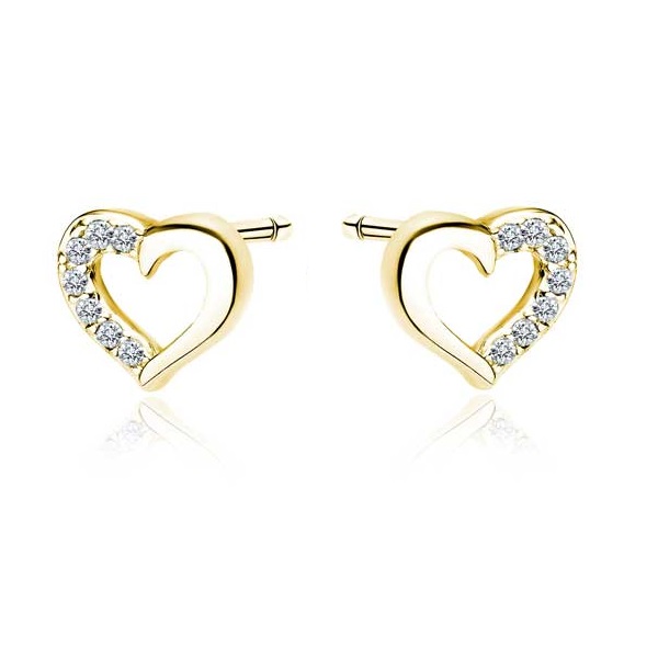 Hopeiset kullatut sydänkorvakorut, joiden toisella puolikkaalla ovat säkenöivät kirkkaat zirkonia-korukivet. Nappikorvakorujen koko on 8 x 9 mm ja niissä on luotettava tappikiinnitys. Valmistusmateriaali on laadukas nikkelitön 925 sterling hopea. Sirot hopeiset nappikorvakorut kulkevat erinomaisesti mukana arjessa ja sopivat moneen tyyliin!