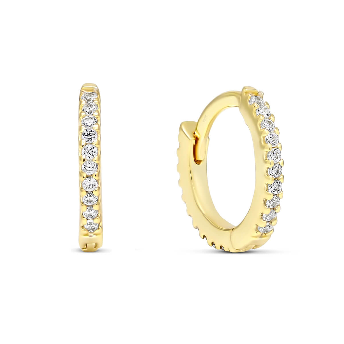 Säihkyvät kullan väriset korvarenkaat zirkonia-korukivillä. Rengaskorvakorut on valmistettu laadukkaasta kullatusta 925 hopeasta ja niiden kiinnitysmekanismina on kätevä saranakiinnitys. Korvakorujen halkaisija on 14 mm ja niiden leveys on 1,5 mm.