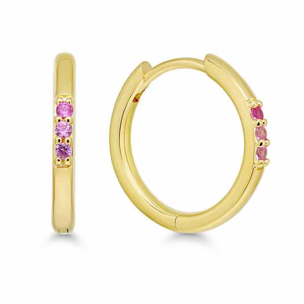 Kullatut rengaskorvakorut vaaleanpunaisin zirkonia-korukivin koristeltuna. Korvarenkaan ulkohalkaisija on 16,5 mm ja leveys 1,8 mm. Korvakoruissa on kätevä saranakiinnitys.