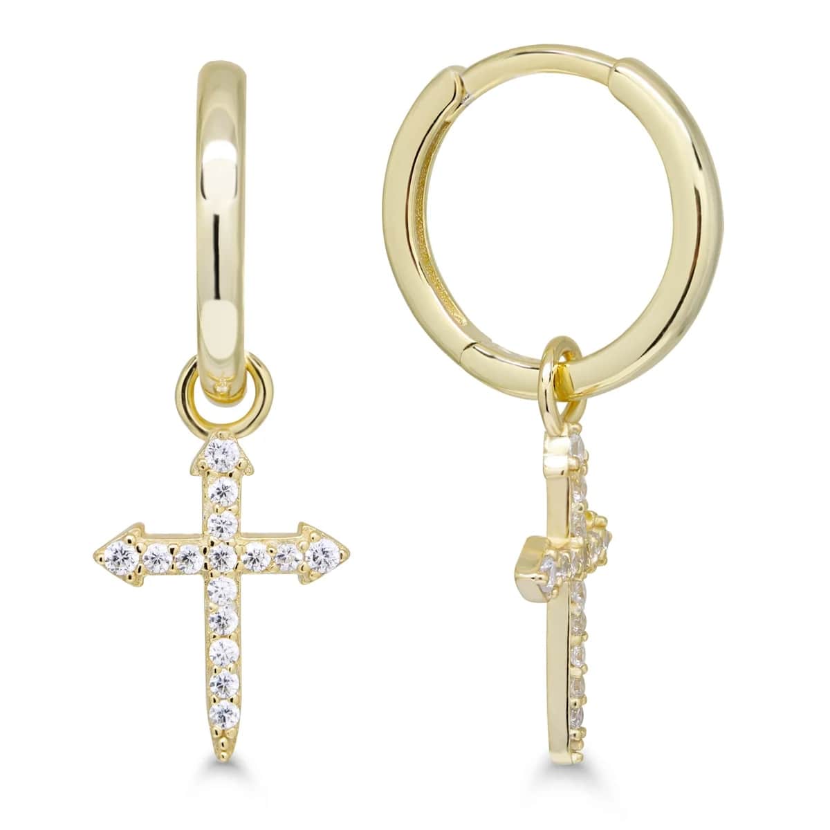 Kullatut korvarenkaat, joita koristavat kauniit roikkuvat ristit zirkonia-korukivin koristeltuina. Korvakorun kokonaispituus on 29 mm. Korvarenkaan halkaisija on 14,7 mm ja ristin koko on 10 x 13 mm. Nämä korvakorut on valmistettu laadukkaasta 925 hopeasta ja niiden kiinnitysmekanismina on kätevä saranakiinnitys.