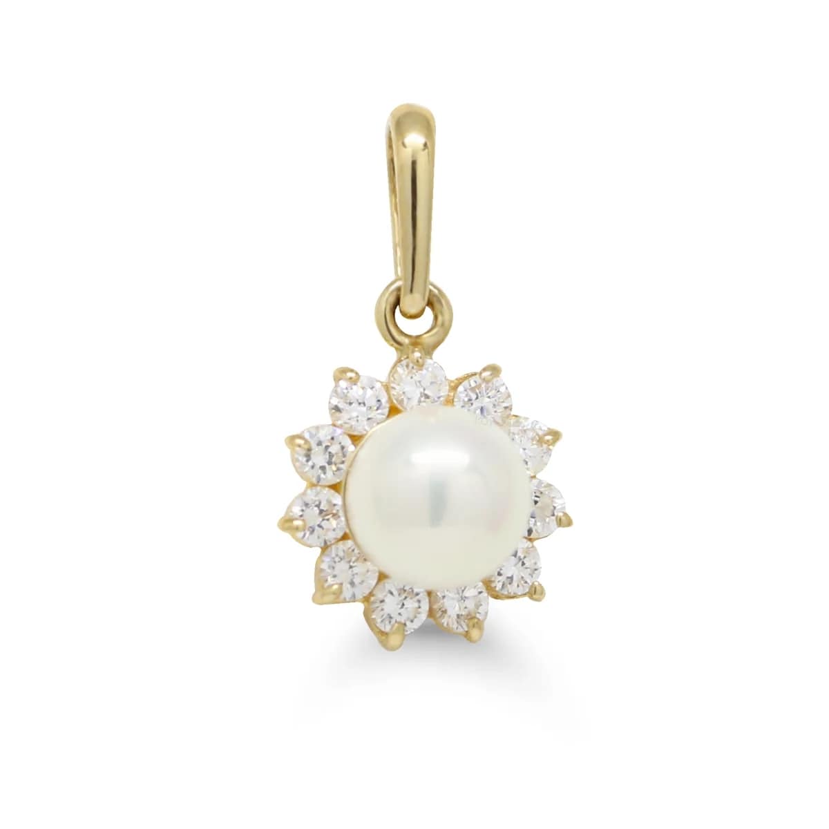 Kultainen riipus helmellä. Aitoa makeanveden helmeä ympäröivät zirkonia-korukivet. Riipuksen leveys on 7,5 mm ja korkeus riipuslenkin kanssa 13 mm. Materiaali 14K keltakulta.
