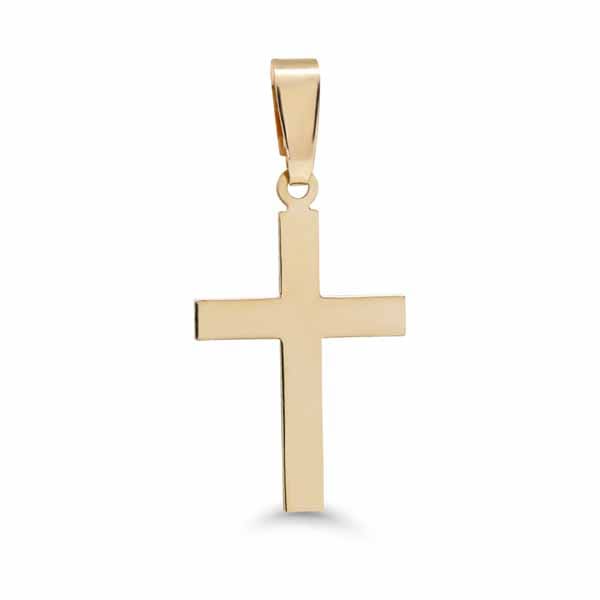 Klassinen keltakultainen ristiriipus sileällä pinnalla. Ristin leveys on 10 mm ja korkeus ilman riipuslenkkiä 14 mm ja riipuslenkin kanssa 20,5 mm. 14K keltakultaa.