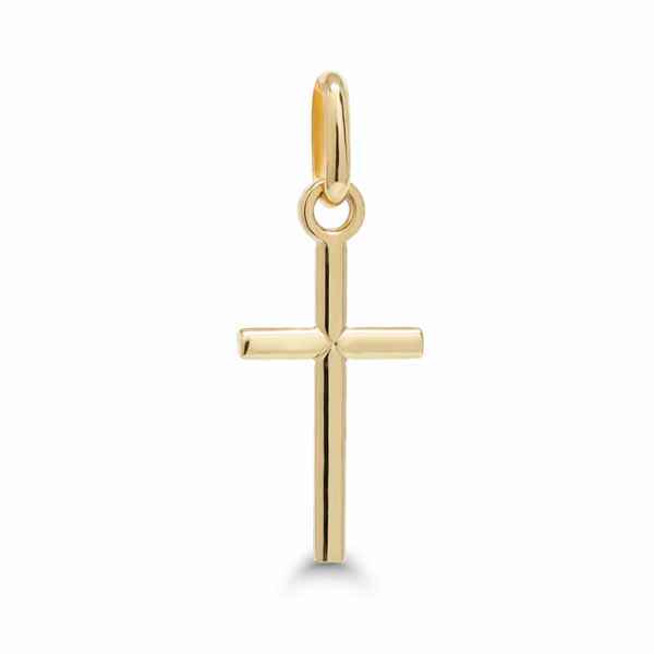 Siro keltakultainen risti sileällä pinnalla. Kultaristin koko on 8 x 16 mm, riipuslenkin kanssa korkeus 20 mm. Valmistusmateriaali on laadukas 14 karaatin keltakulta.