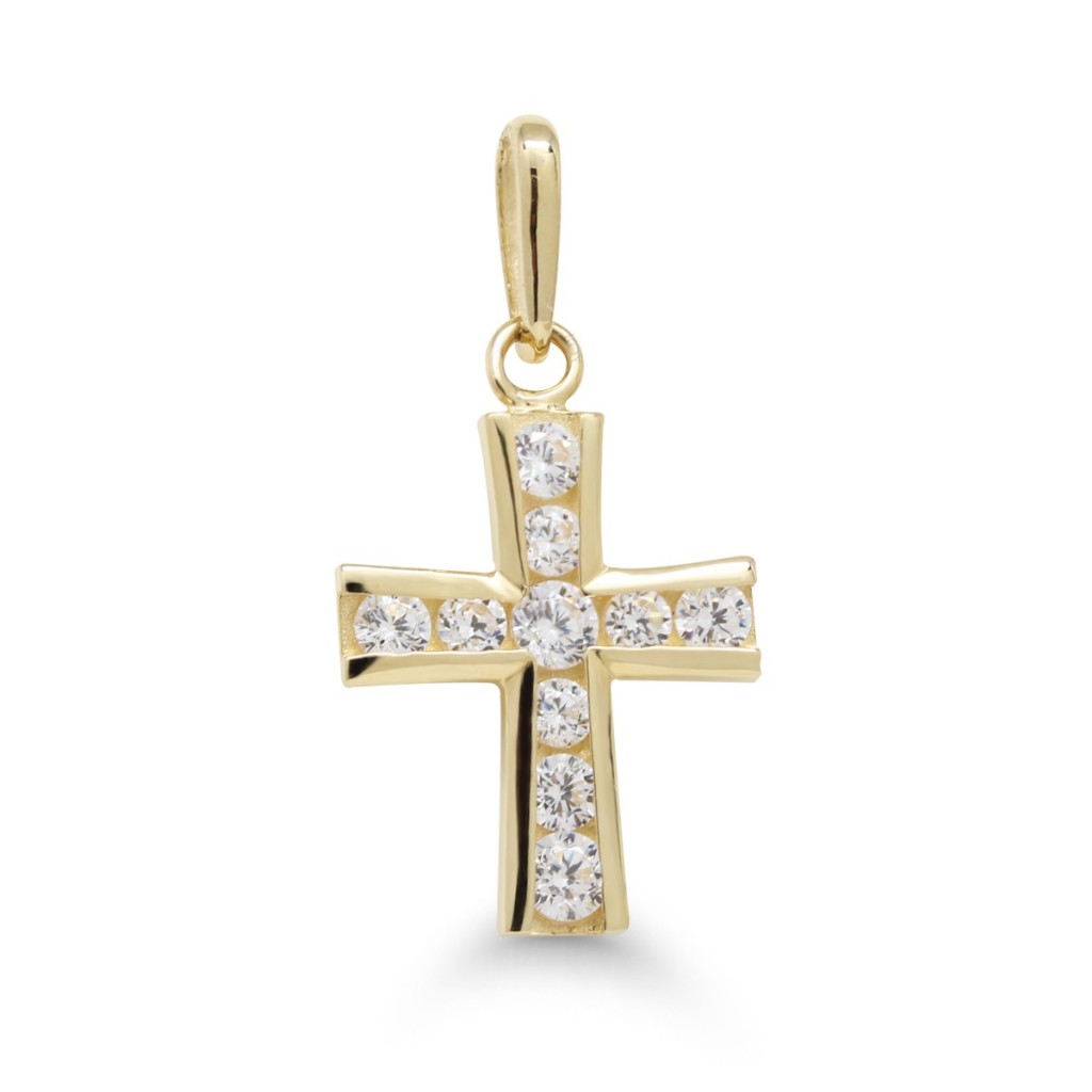 Kultaristi kirkkailla zirkoneilla. Tämä 14 karaatin keltakullasta valmistettu ristiriipus ihastuttaa kirkkailla korukivillään. Ristin korkeus ilman riipuslenkkiä on 12 mm ja leveys on 10 mm. Kultainen rippiristi on erinomainen rippilahja! Huomioithan, että riipus ei sisällä ketjua.