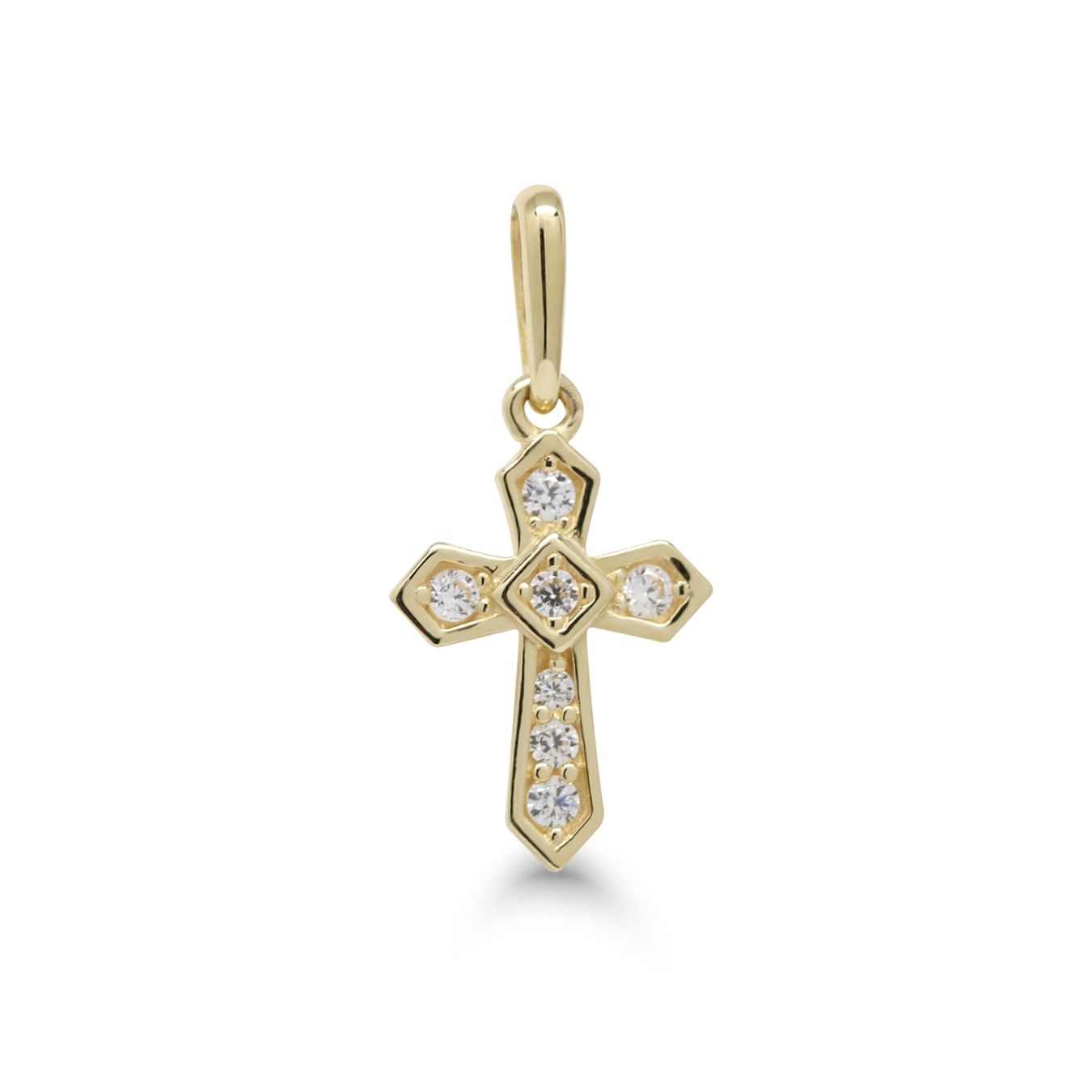 Kultainen risti kirkkailla zirkoneilla. Tämä 14 karaatin keltakullasta valmistettu ristiriipus ihastuttaa kauniilla muodollaan ja kirkkailla korukivillään. Erinomainen rippiristi!