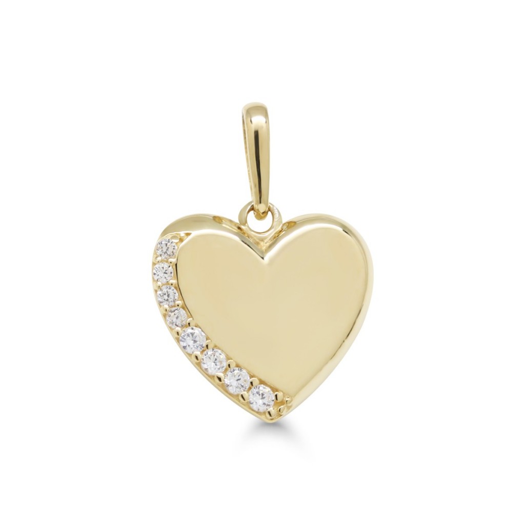 Naisten sydämen muotoinen kultariipus kirkkailla korukivillä. Tämän 14 karaatin keltakullasta valmistetun sydänriipuksen reunaa koristavat zirkoniat. Koruosan koko on 10,5 mm.