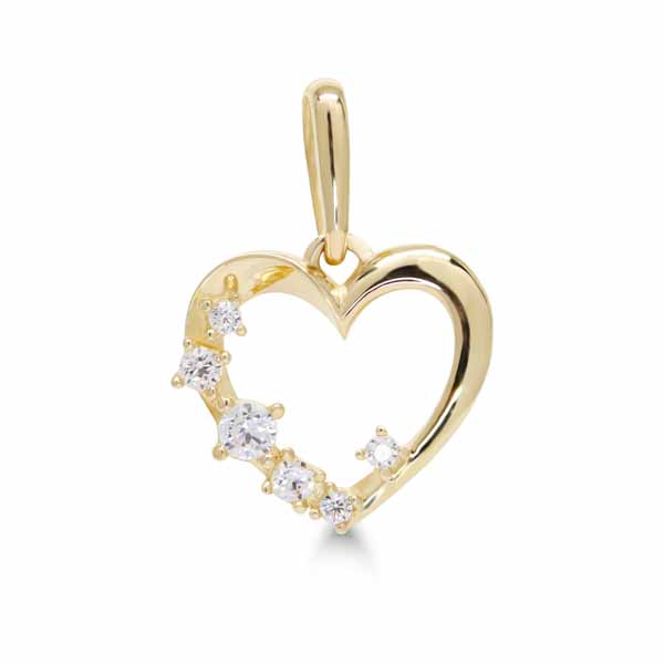 Kaunis kultainen sydänriipus kirkkailla zirkonia-korukivillä. Koruosan koko on 9 mm, riipuslenkin kanssa riipuksen korkeus on 14,7 mm. Materiaali on laadukas 14 karaatin keltakulta