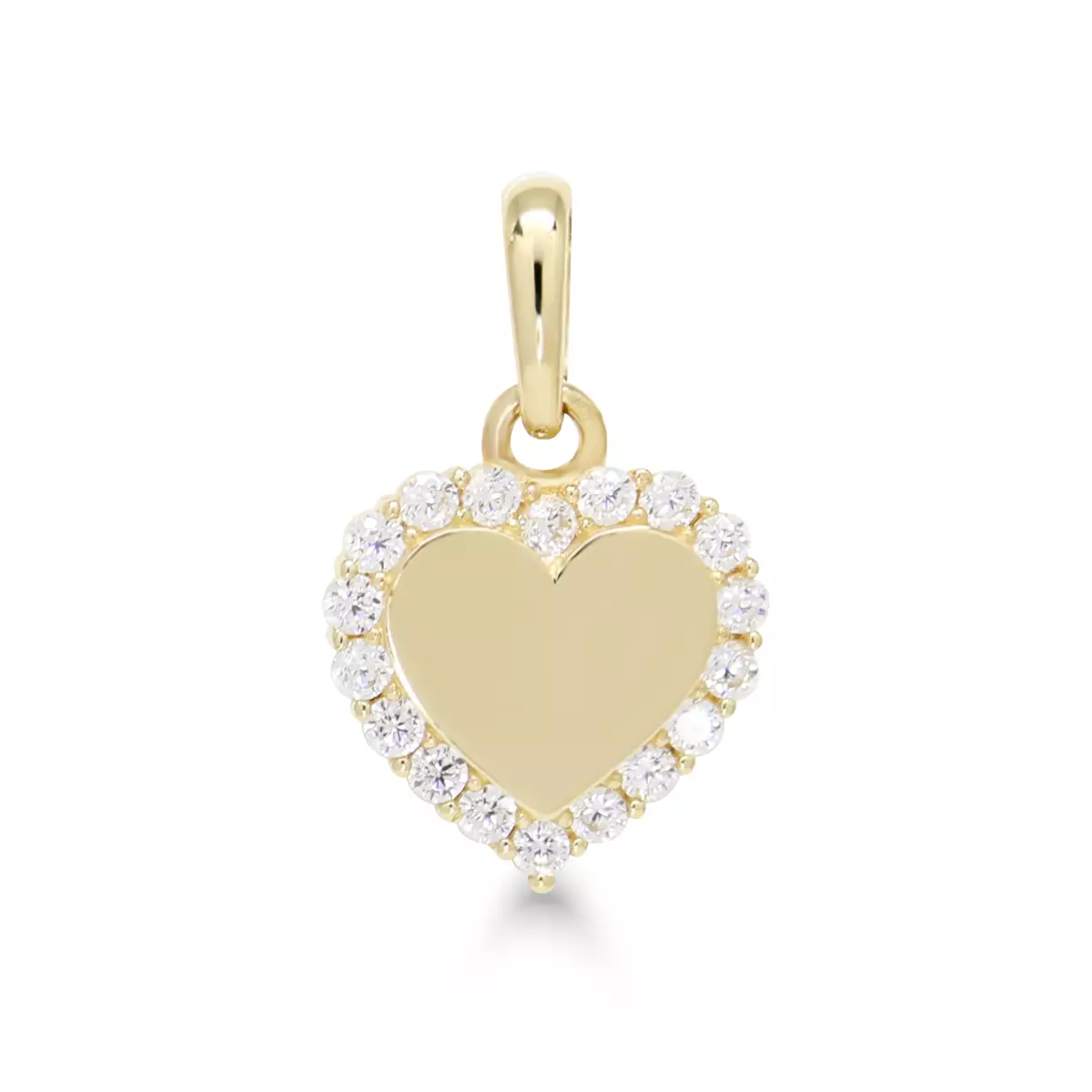 Sydämen muotoinen kultariipus kirkkailla zirkonia-korukivillä koristeltuna. Riipuksen leveys on 7,5 mm ja korkeus 9 mm, riipuslenkin kanssa 12,5 mm. 14 karaatin keltakultaa.