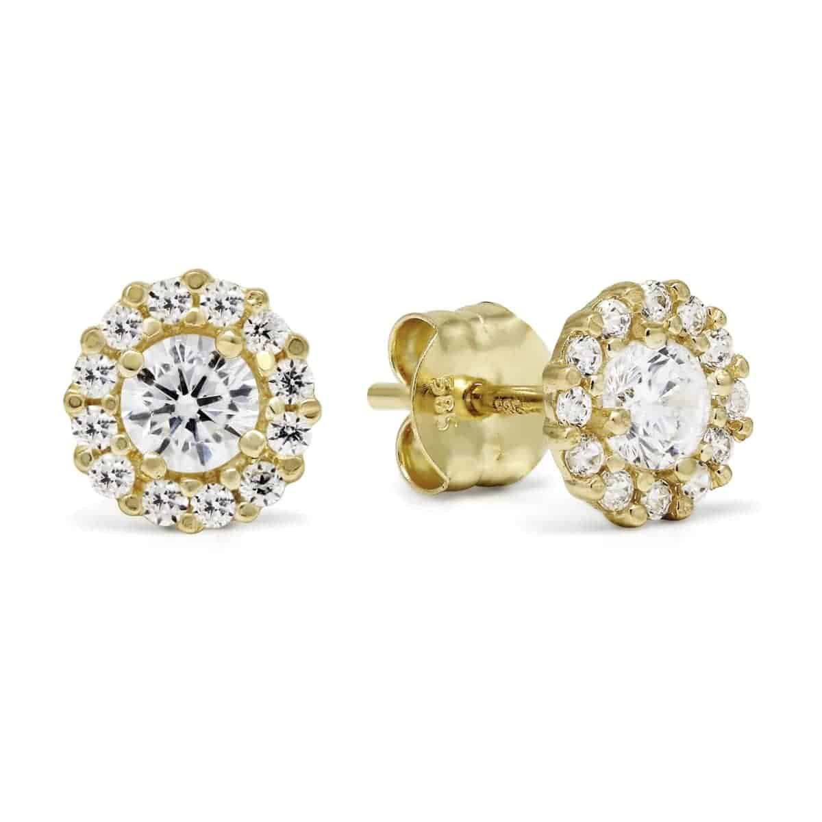 Naisten 14 karaatin keltakultaiset tappikorvakorut. Näitä pyöreitä kultakorvakoruja koristavat säkenöivät zirkonia-korukivet. Korvakorujen koko 5 mm. Tappikiinnitys.