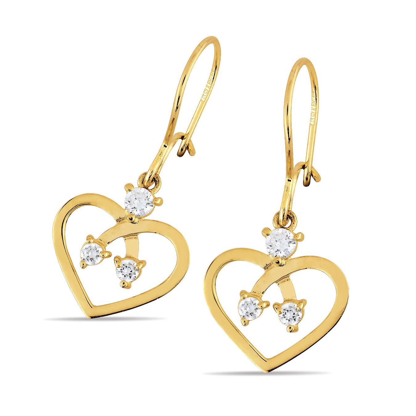 Ihanat kevyet ja hieman näyttävät roikkuvat kultaiset sydänkorvakorut zirkoneilla ja lukollisella koukkukiinnityksellä. Materiaali 14 karaatin keltakultaa.