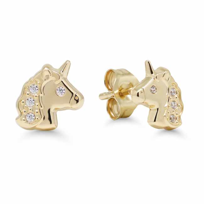 Lasten 14 karaatin keltakultaiset yksisarviskorvakorut. Siroissa yksisarvisen muotoisissa kultakorvakoruissa säihkyvät kirkkaat zirkonia-korukivet. Nappikorvakoruissa on tukeva tappikiinnitys. Suloiset kultaiset korvakorut, joita voi käyttää arjessa!
