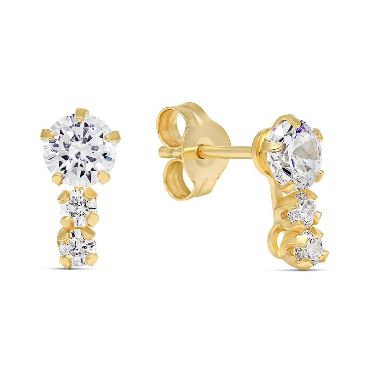 Kultakorvakorut zirkonia-korukivillä. Tätä kultaista nappikorvakorua koristaa kolme kappaletta kirkasta zirkoniaa. Korvakorujen koko on 4,3 x 8,5 mm. Korvakoruissa on tukeva tappikiinnitys. Materiaali on laadukas 14 karaatin keltakulta.