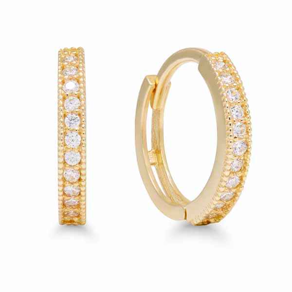 Keltakultaiset korvarenkaat kirkkailla zirkonia-korukivillä. Korvakorun koko on 2 x 12,5 mm. Valmistusmateriaali on laadukas 14 karaatin keltakulta. Saranakiinnitys.