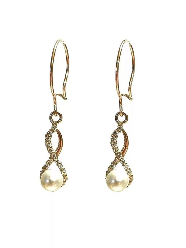 Naisten 14 karaatin keltakultaiset korvakorut. Roikkuvat kultakorvakorut kahdeksikon muodossa, ja niitä koristavat kirkkaat zirkoniat ja helmet. Korvakoruissa on koukkukiinnitys.