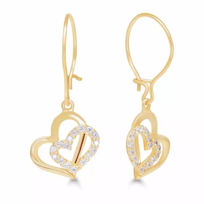 Naisten 14 karaatin keltakultaiset roikkuvat kultakorvakorut. Näitä sydämellisiä roikkuvia koukkukorvakoruja koristavat säkenöivät zirkonia-korukivet. Korvakoruissa on lukollinen koukkukiinnitys. Korvakorujen koruosan korkeus ja leveys on 10 mm. Kokonaiskorkeus koukun kanssa 24 mm.