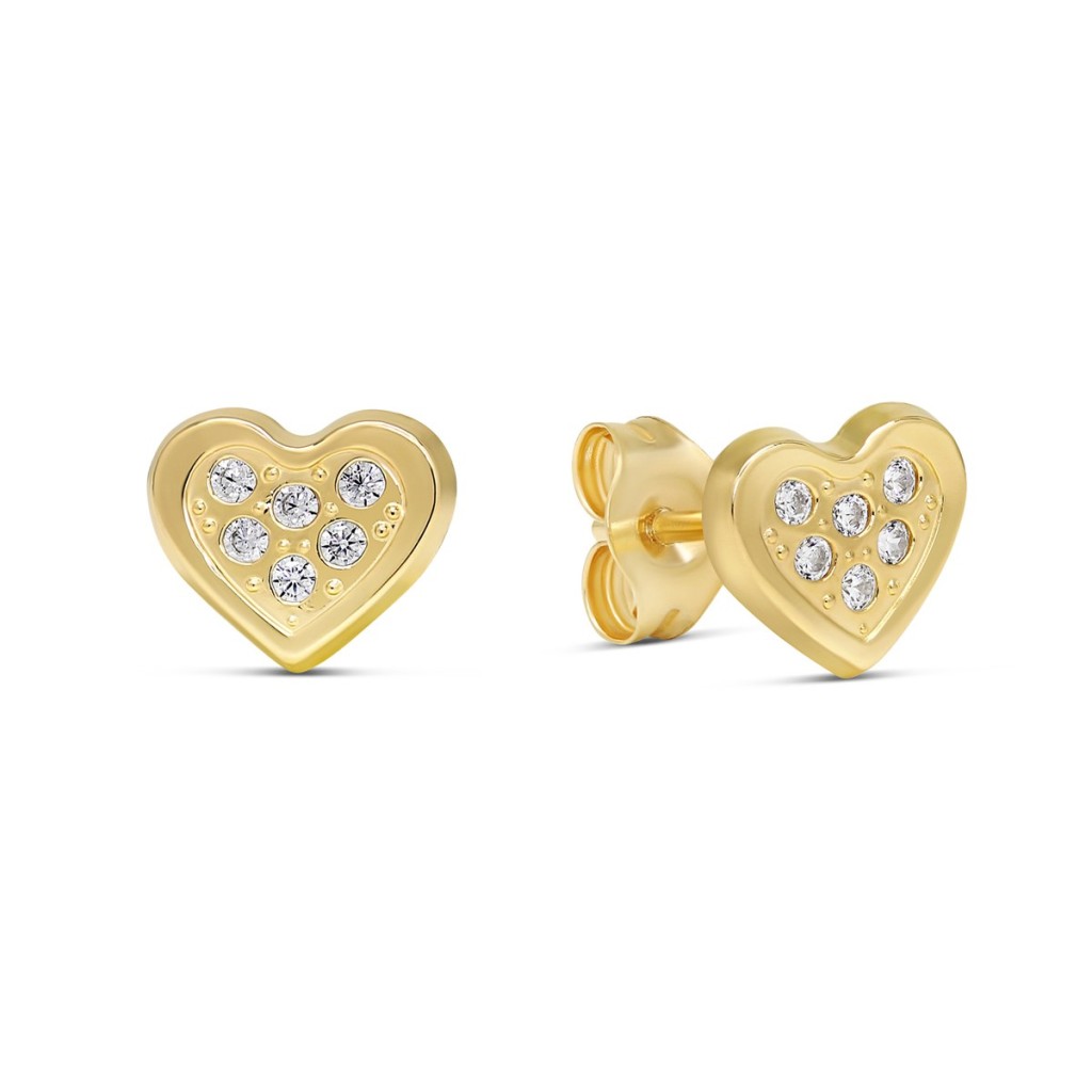 Lasten 14 karaatin keltakultaiset sydänkorvakorut. Siroissa sydämen muotoisissa kultakorvakoruissa säihkyvät kirkkaat zirkonia-korukivet. Nappikorvakoruissa on tukeva tappikiinnitys. Suloiset kultaiset korvakorut, joita voi käyttää arjessa!