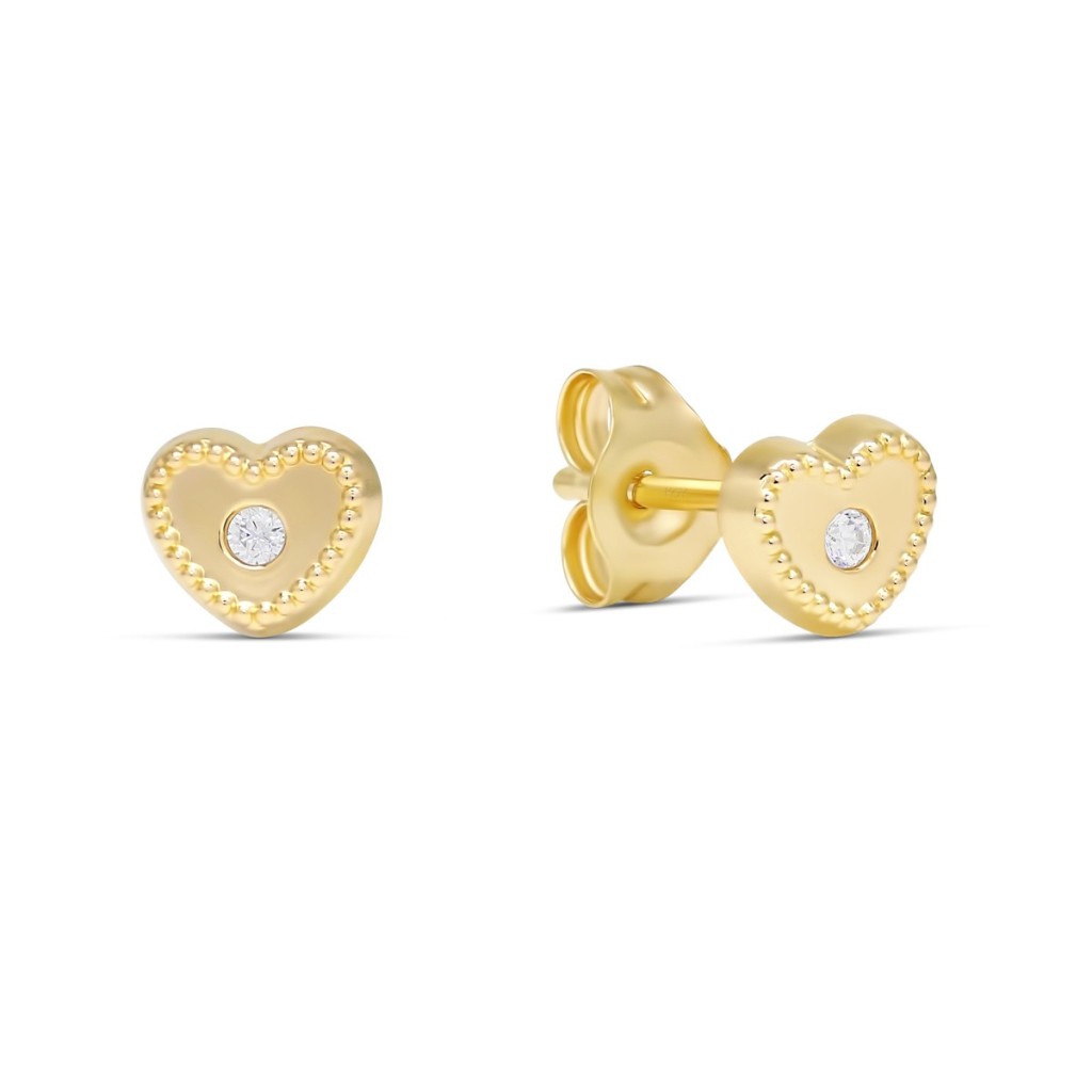 Lasten 14 karaatin keltakultaiset sydänkorvakorut. Siroissa sydämen muotoisissa kultakorvakoruissa säihkyvät kirkkaat zirkonia-korukivet. Nappikorvakoruissa on tukeva tappikiinnitys. Suloiset kultaiset korvakorut, joita voi käyttää arjessa!