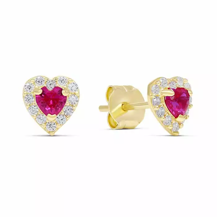 Keltakultaiset korvakorut punaisilla ja kirkkailla zirkonia-korukivillä koristeltuina. Sydänkorvakorun koko on 5,4 x 5,7 mm. Valmistusmateriaali on laadukas 14 karaatin keltakulta. Korvakoruissa on tukeva ja luotettava tappikiinnitys.
