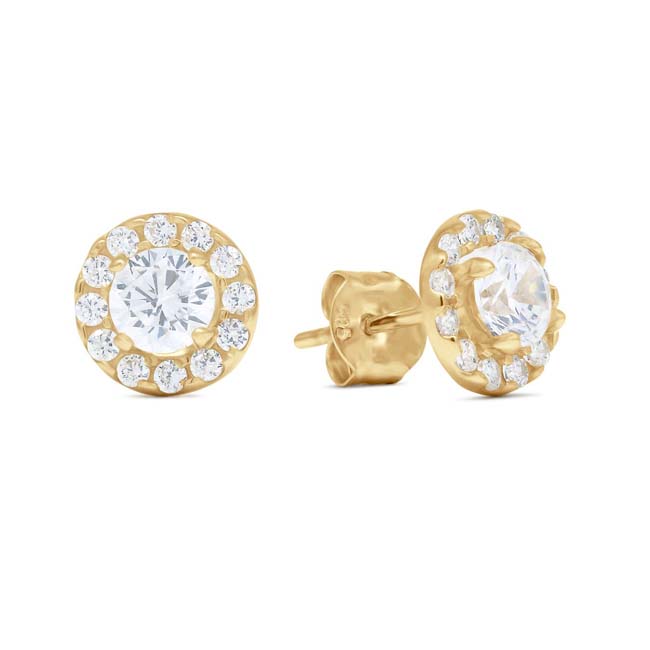 Kultakorvakorut, jossa zirkoneilla koristeltu rengas ja keskellä isompi kivi.