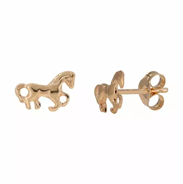 Lasten kultakorvakorut hevosilla. Korvakorun koko on noin 9 x 5 mm. Valmistusmateriaali on laadukas 14 karaatin keltakulta. Korvakoruissa on tukeva ja luotettava tappikiinnitys.