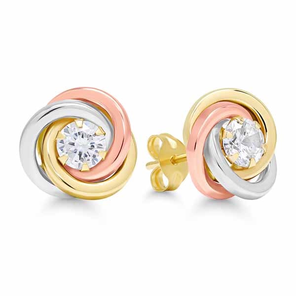 Kolmiväriset kultakorvakorut kirkkaalla zirkonia-korukivellä. Solmukorvakorun koko on 10 mm. Valmistusmateriaali on laadukas 14 karaatin keltakulta, valkokulta ja punakulta. Korvakoruissa on tukeva ja luotettava tappikiinnitys. Klassiset kultaiset korvakorut ilahduttavat arjessa ja juhlassa!
