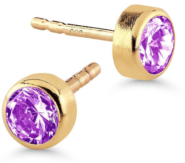 Kauniit kultakorvakorut violetilla synteettisella zirkonilla. Korvakorut ovat 14k keltakultaa.