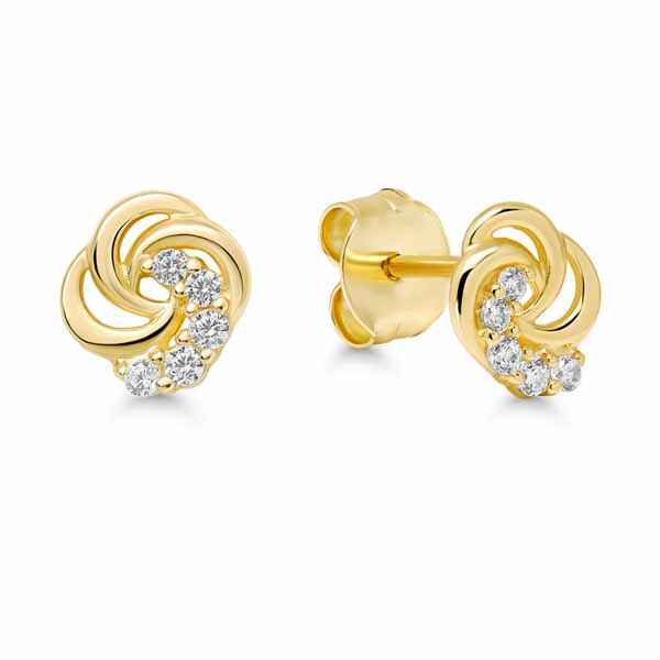 Keltakultaiset solmun muotoiset sirot kultaiset korvakorut kirkkailla zirkonia-korukivillä. Korvakorun koko on 5,5 mm. Valmistusmateriaali on laadukas 14 karaatin keltakulta.