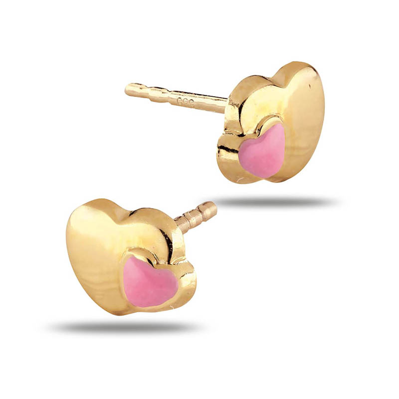 Keltakultaiset sirot kultaiset korvakorut vaaleanpunaisilla sydämillä. Korvakorun koko on 5 x 4 mm. Valmistusmateriaali on laadukas 14 karaatin keltakulta. Tappikiinnitys.