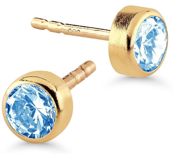 Kauniit kultakorvakorut vaaleansinisillä synteettisella zirkonilla. Korvakorut ovat 14k keltakultaa.