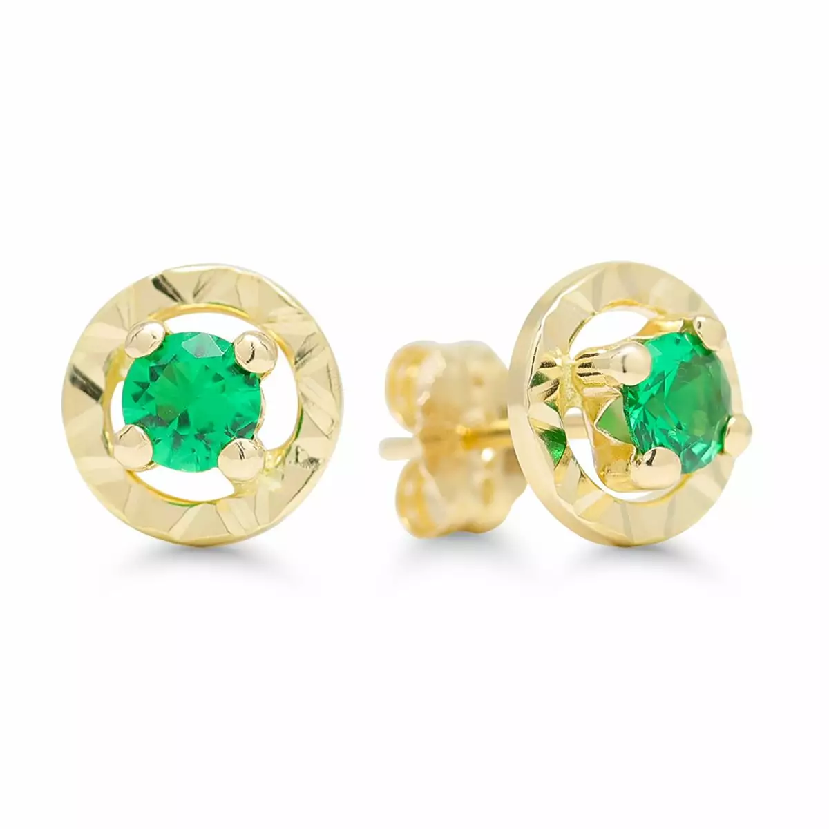 Keltakultaiset pyöreät korvakorut vihreillä zirkonia-korukivillä. Valmistusmateriaali on laadukas 14 karaatin keltakulta. Korvakoruissa on tukeva ja luotettava tappikiinnitys.